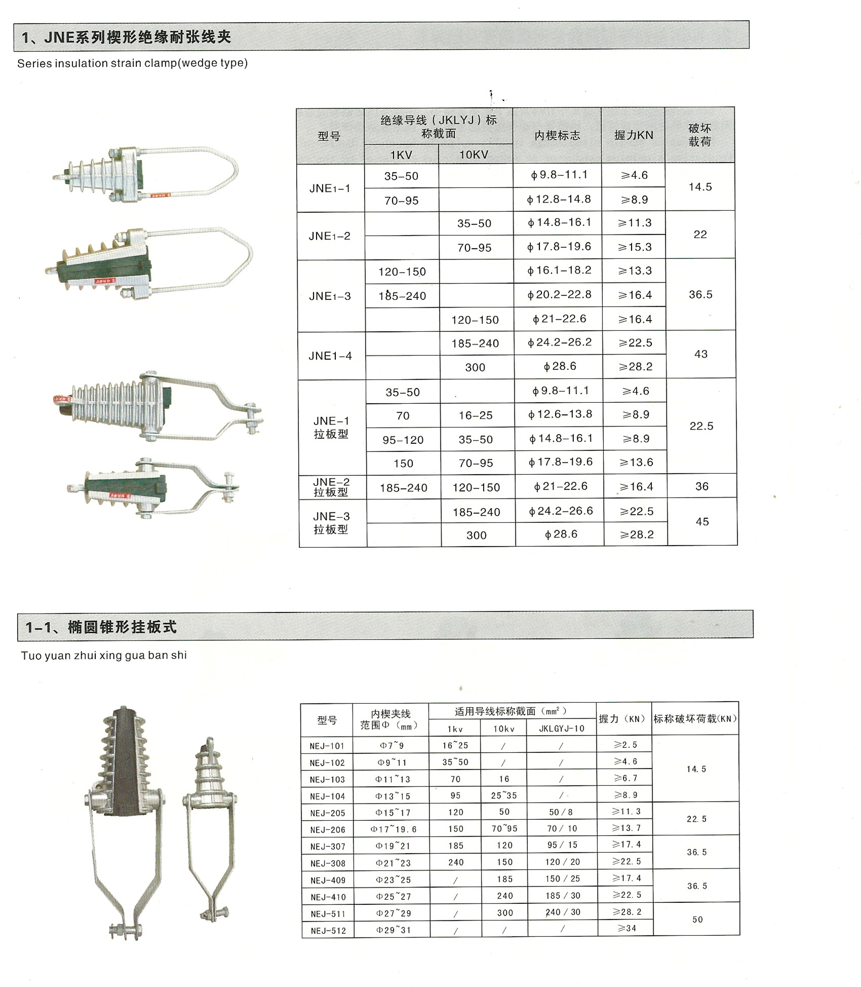 JNE系列楔形绝缘耐张线夹,主要型号有:JNE-1,JNE-2,JNE-3,JNE-4,JNE-1拉板型,JNE-2拉板型,JNE-3拉板型,NEJ-101,NEJ-102,NEJ-103,NEJ-104,NEJ-205,NEJ-206,NEJ-307,NEJ-308,NEJ-409,NEJ-410,椭圆锥形挂板式耐张线夹