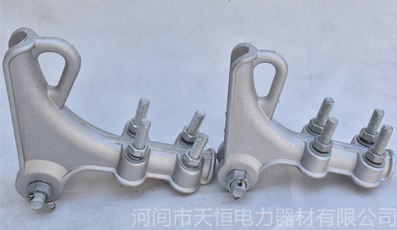 耐张线夹用来将导线或避雷线固定在非直线杆塔耐张绝缘子串,起锚作用,亦用来固定拉线杆塔的拉线。