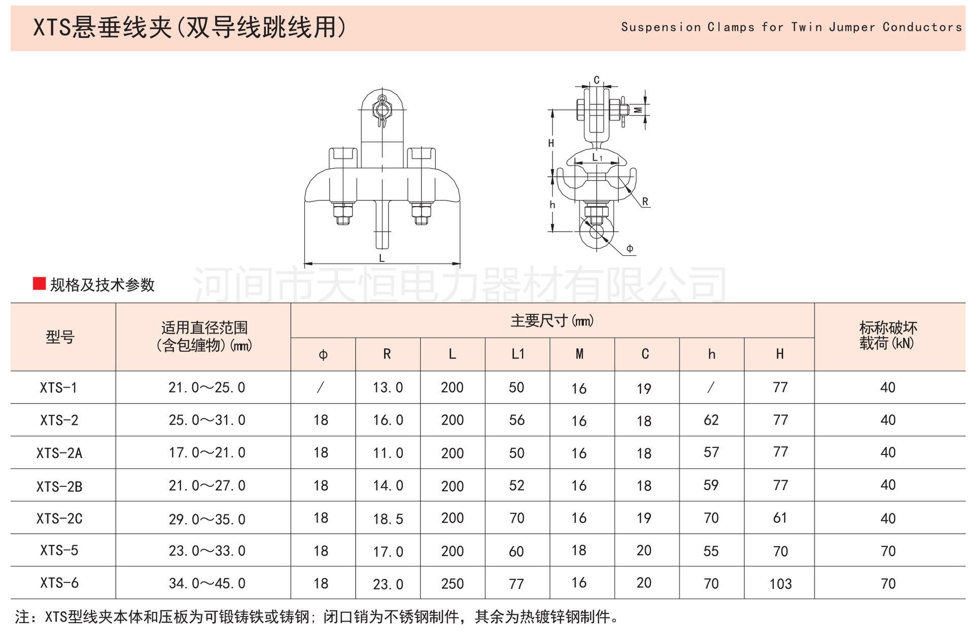 双导线跳线悬垂线夹XTS-6034常有的定型产品,现在保留了U型螺栓式样(通常叫船型线夹),它是由挂架U型螺栓,可锻铸铁制造的线夹船体、压板组成。另一种就是预绞式悬垂线夹。悬垂线夹用于将导线固定在直线杆塔的绝缘子串上,或将避雷线悬挂在直线杆塔上,亦可用于换位杆塔上支持换位导线以及耐张转角杆塔跳线的固定。